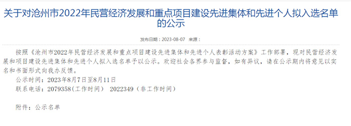 近日,河北滄海核裝備科技股份有限公司榮膺“2022年度滄州市民營經濟發(fā)展優(yōu) 秀企業(yè)”榮譽稱號,董事長趙德清獲民營經濟發(fā)展先 進個人稱號。